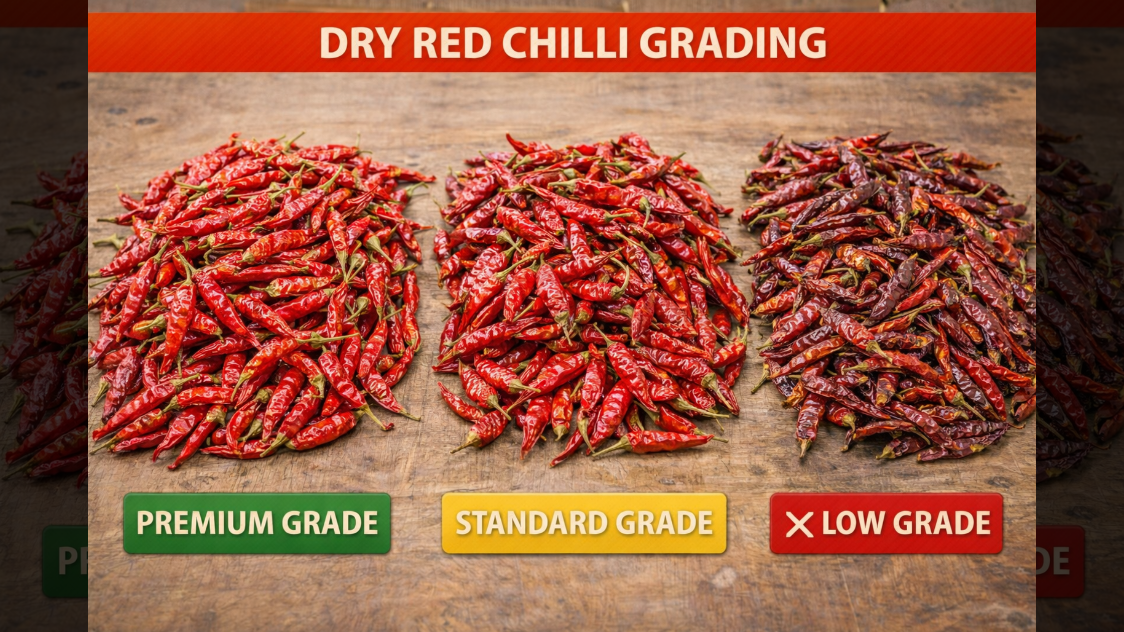 Chilli grading standards classify produce by size, colour, stem retention, and defect levels. Premium grades contain whole pods with stems attached, minimal breakage, and zero foreign matter. Commercial grades may include some broken pieces and slight colour variation but should still meet baseline quality thresholds.