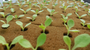 Moisten the cubes slightly and place one or two seeds per slot. Keep them in a warm and slightly shaded area for 2–3 days. You will see tiny shoots appearing soon.