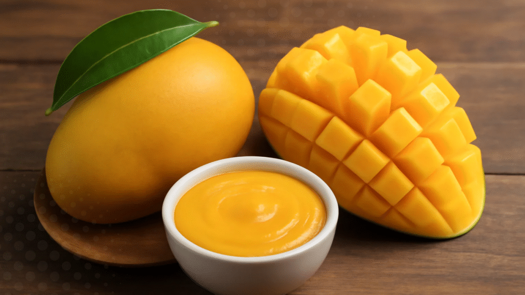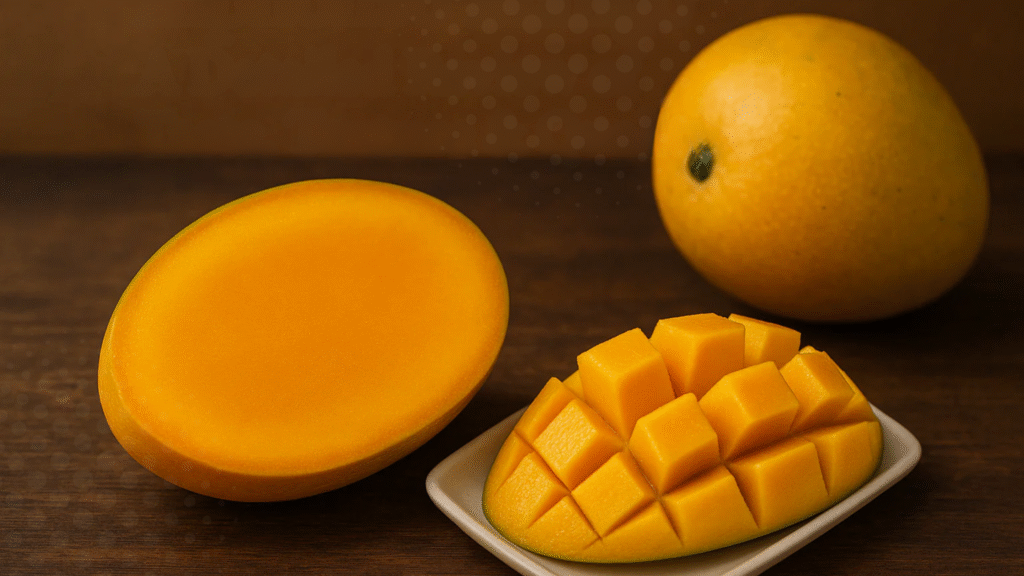 Once cut open, a real Alphonso mango reveals deep saffron-colored pulp. The texture is smooth, creamy, and almost fiberless. This silky consistency is a key reason Alphonso mango