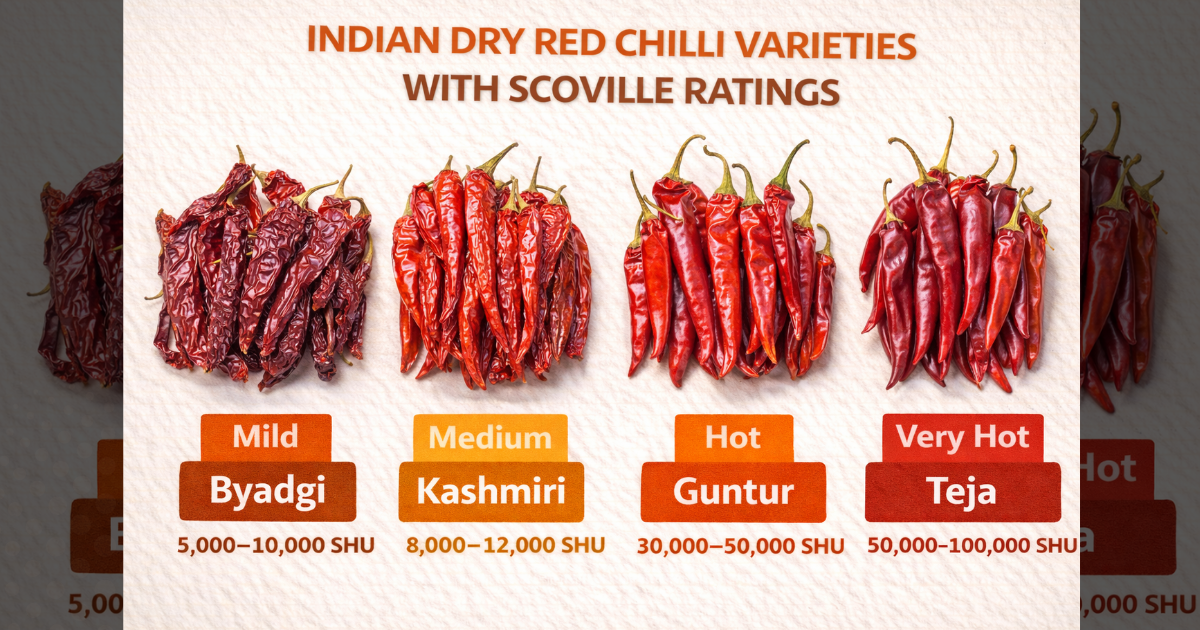 Knowing the heat rating of your dry red chillies empowers you to cook with confidence. If a recipe calls for mild heat, reaching for Kashmiri chillies at 1,500 SHU makes sense. For medium heat, Byadgi works beautifully. When you want fire, Guntur or similar high-SHU varieties deliver.