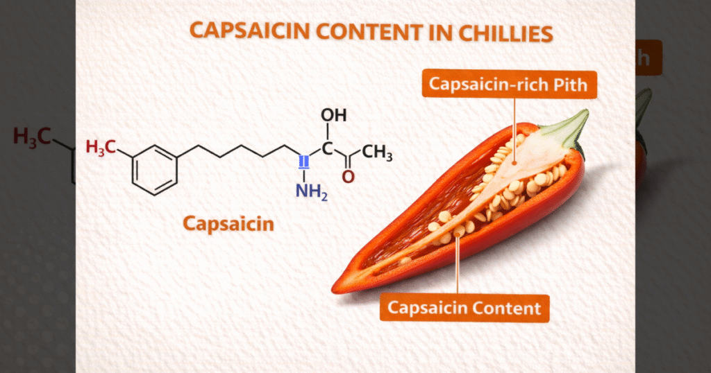 The burning sensation you experience from chillies comes from capsaicin and related compounds called capsaicinoids. These molecules are concentrated primarily in the white pith and seeds inside the pepper. When capsaicin comes into contact with pain receptors in your mouth, it triggers a heat response—though no actual temperature change occurs.